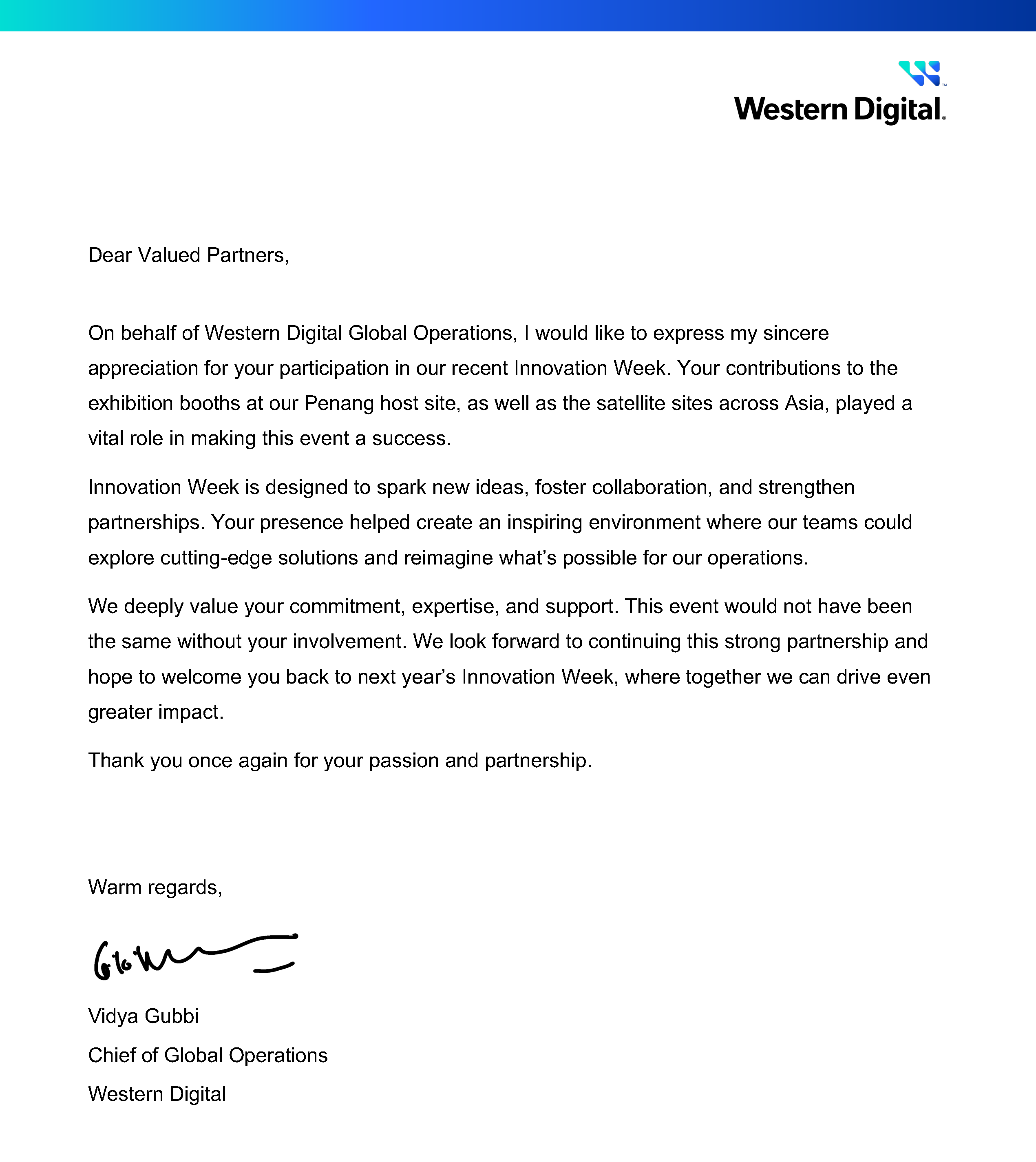 圖:瑞松科技收到來自西部數(shù)據(jù)公司的感謝函