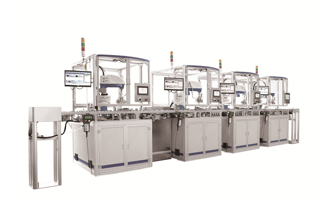 ??該生產(chǎn)線由4個(gè)單機(jī)型機(jī)器人工作站組成,通過(guò)集成視覺(jué)檢測(cè)及對(duì)位、治具自動(dòng)裝配、自動(dòng)上PCB板、自動(dòng)點(diǎn)膠、自動(dòng)貼裝芯片及其它各種輔材等功能來(lái)實(shí)現(xiàn)IC的疊裝生產(chǎn)。采用模塊化柔性線體設(shè)計(jì),可根據(jù)不同產(chǎn)品工藝添加或減少工作站來(lái)進(jìn)行相對(duì)應(yīng)的作業(yè)。采用高精度SCARA機(jī)器人與高精密視覺(jué)檢測(cè)及對(duì)位系統(tǒng)的配合,工作效率高,精度高達(dá)±0.02mm,且組裝穩(wěn)定性高,可滿足客戶多種產(chǎn)品的切換。