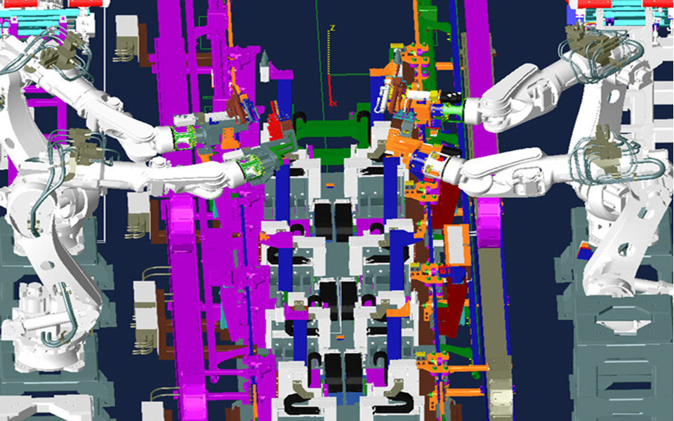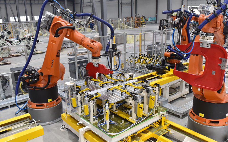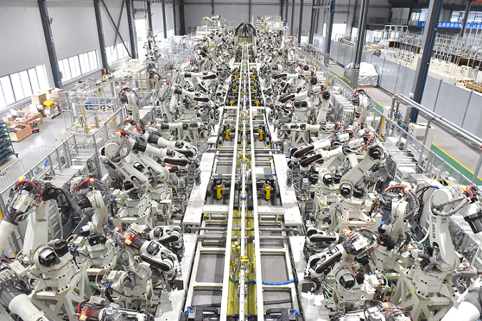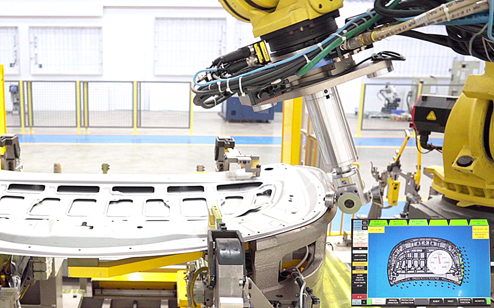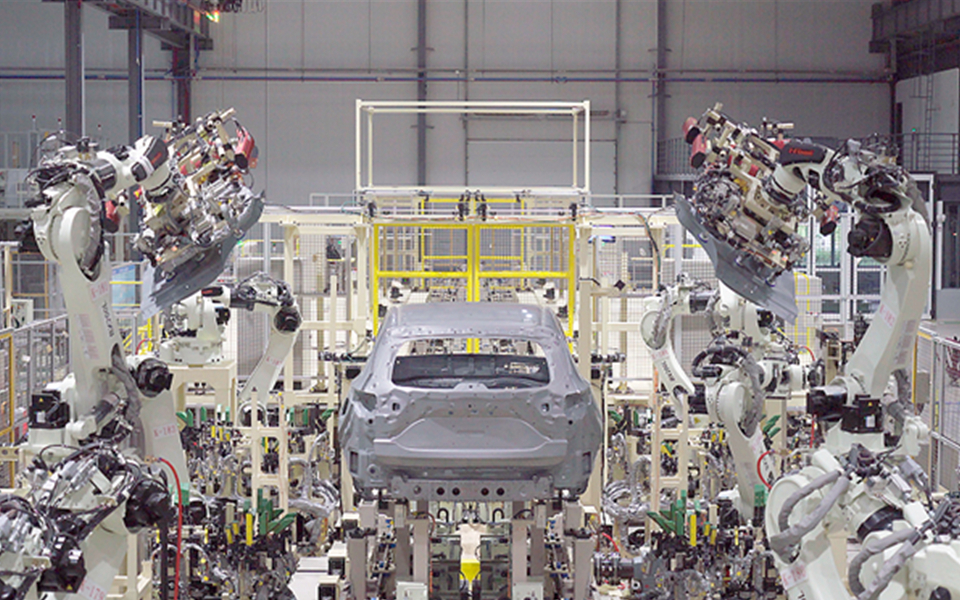 白車身柔性高速智能化總拼技術(shù),綜合運用視覺引導(dǎo)、伺服定位、柔性無源臺車、智能車型切換裝置、柔性滾邊、離線調(diào)試等技術(shù),實現(xiàn)白車身柔性高速智能化生產(chǎn)。
